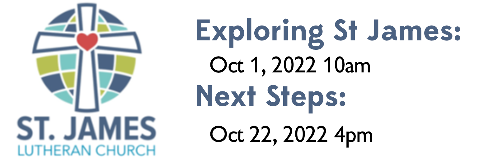 Come enjoy interesting conversations with staff and ministry leaders and share your questions and thoughts about St. James. And of course, we will enjoy good food. On October 1st we will have brunch and on the 22nd we will have dinner together. Childcare will be provided. RSVP by September 30. Feel free to speak with Pastor Chris, Janet Hilsmier or Bobbie Hoffman about any questions you have.